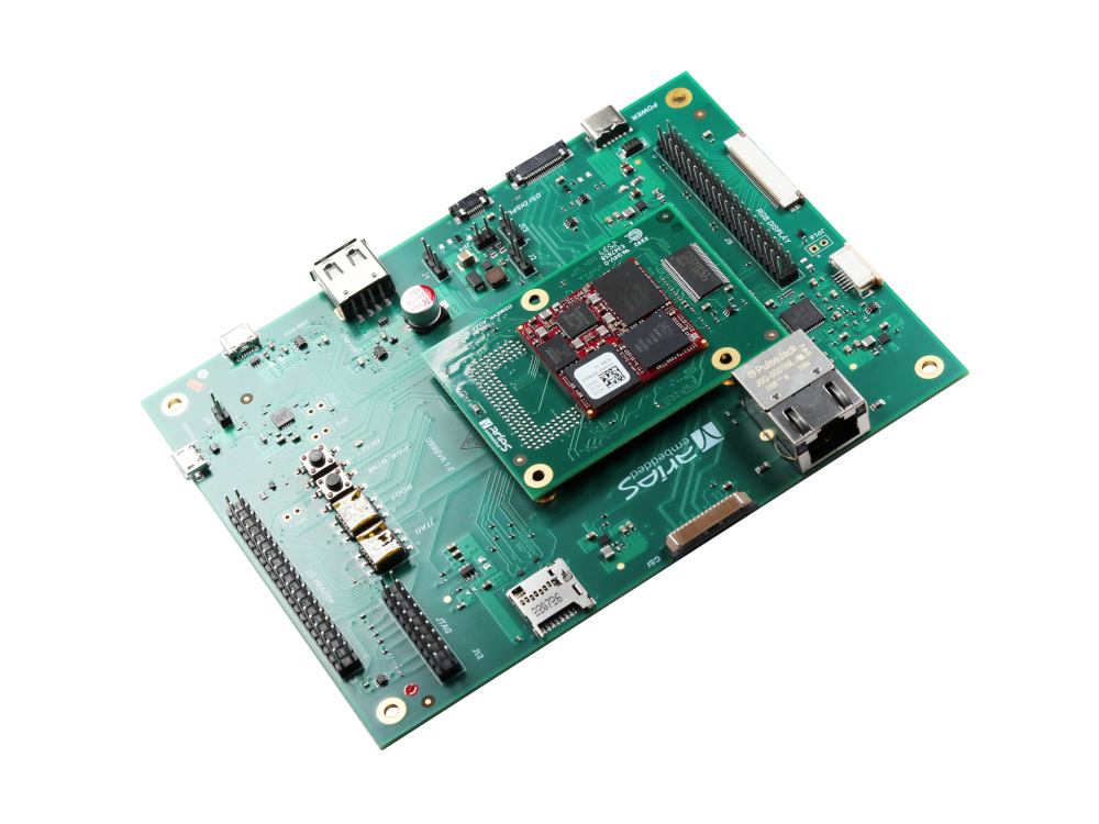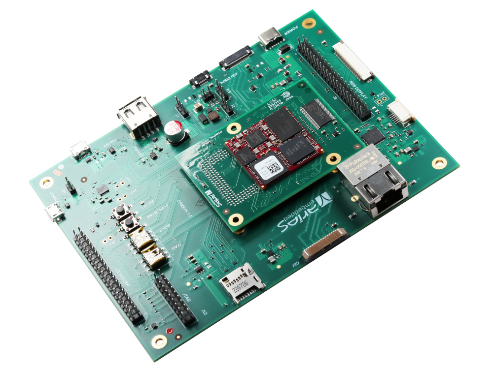 The baseboard supports SoMs which are compatible to the OSM specification as well as SoMs compliant to proprietary implementations. The evaluation system consists out of the