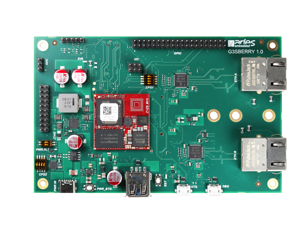 The G3Sberry baseboard is build around the MSRZG3S System on Module. The G3Sberry supports users to have a smooth start-up with the new CPU architecture RZ/G3S by Renesas. It supports all necessary features to make first steps with the CortexA55 CPU architecture, develop and debug drivers and the bootloader and even to use it in prototype setups.